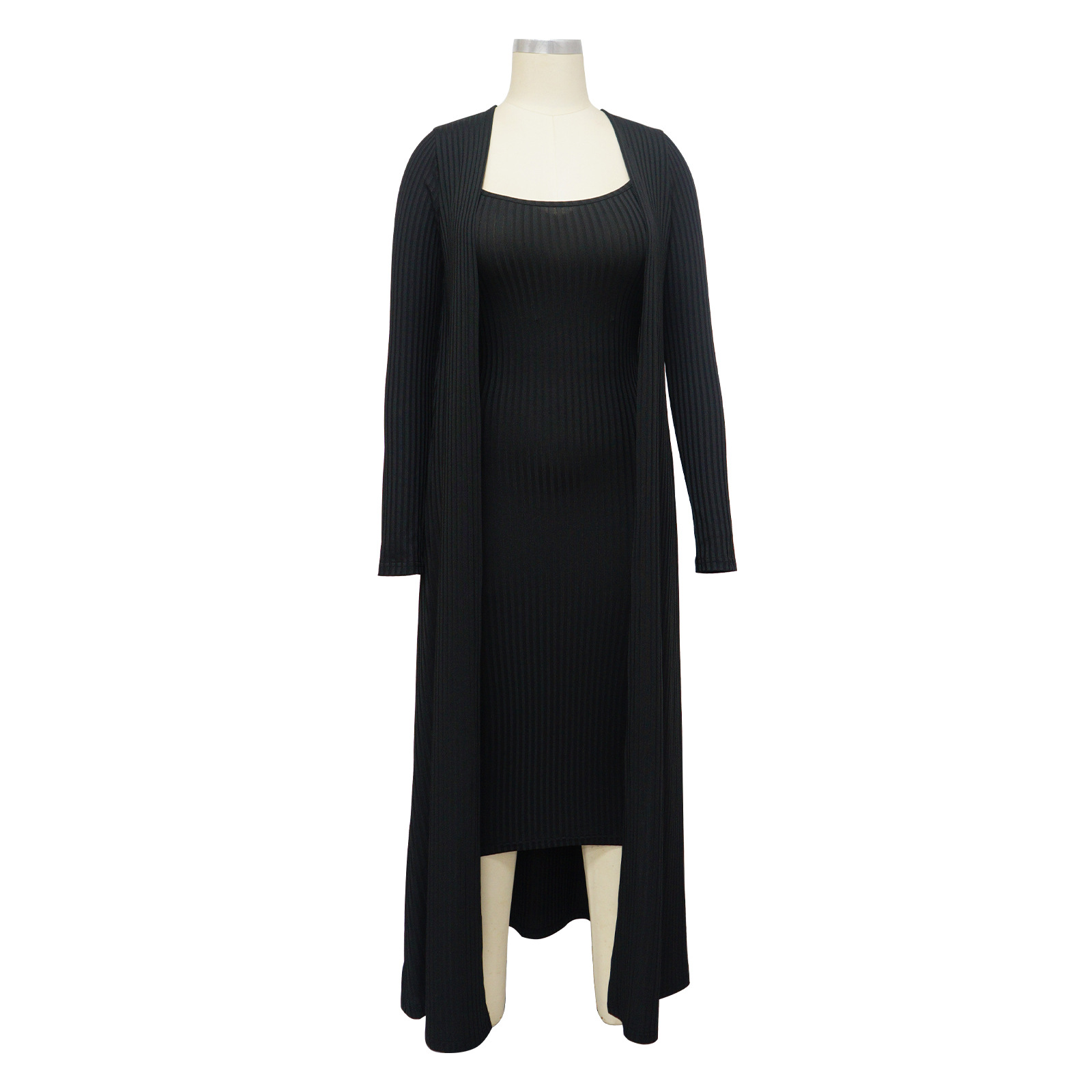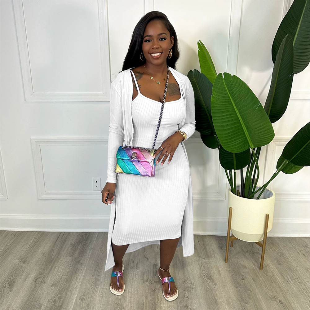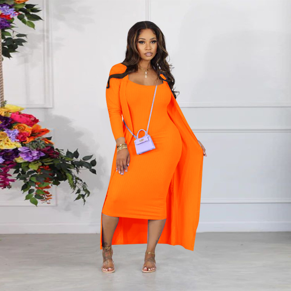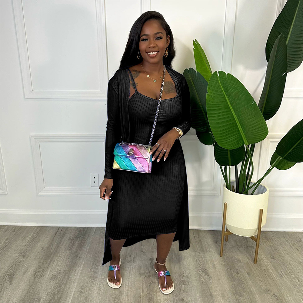 Experience the epitome of modern glamour with our Long Sleeved Coat U Neck Sling Midi Dress Two Piece Set. The U-neck sling midi dress and accompanying coat create a harmonious blend of sophistication and style.