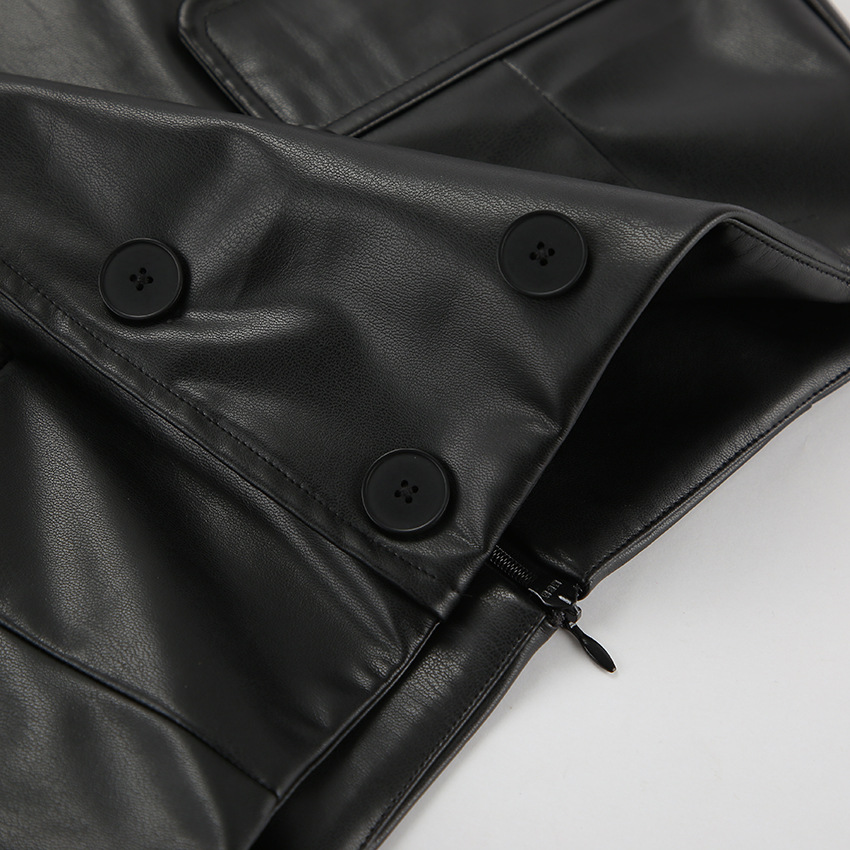 This sleek and edgy slim-fit skirt is crafted from premium faux leather, features an asymmetric design with stylish buttons, pockets, and zipper details. Its high-rise silhouette and short length offer a bold, modern look that's perfect for turning heads.
