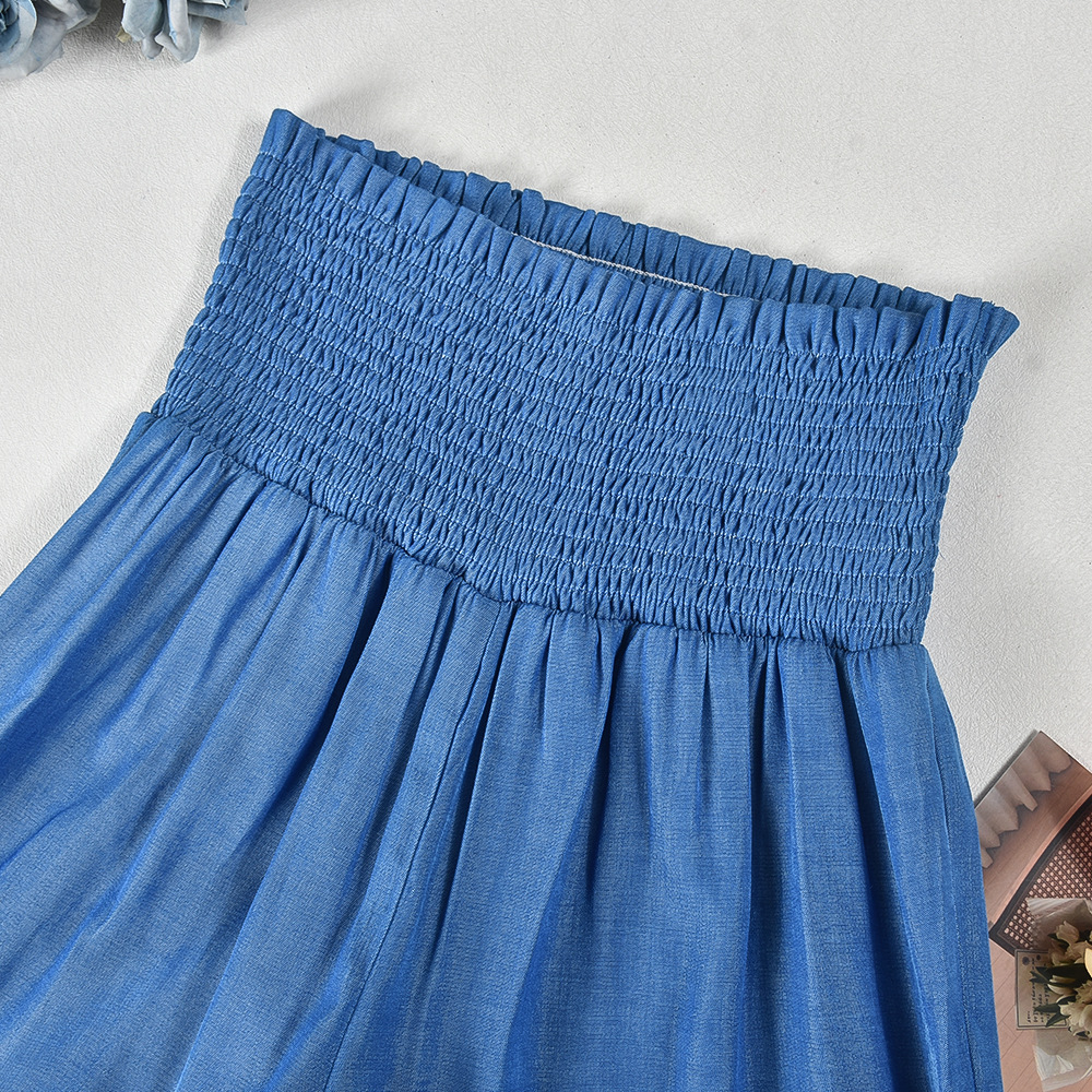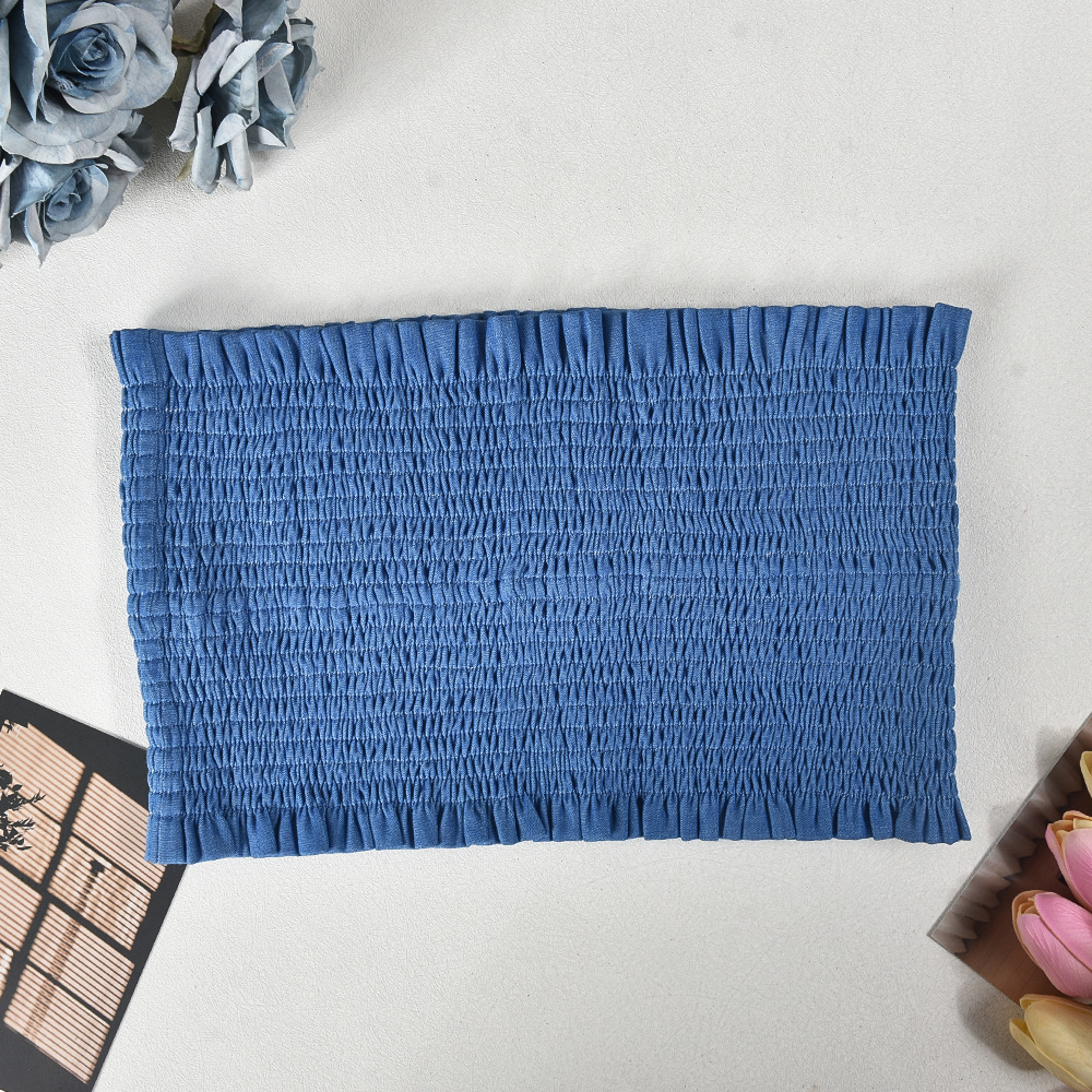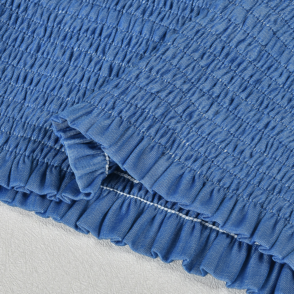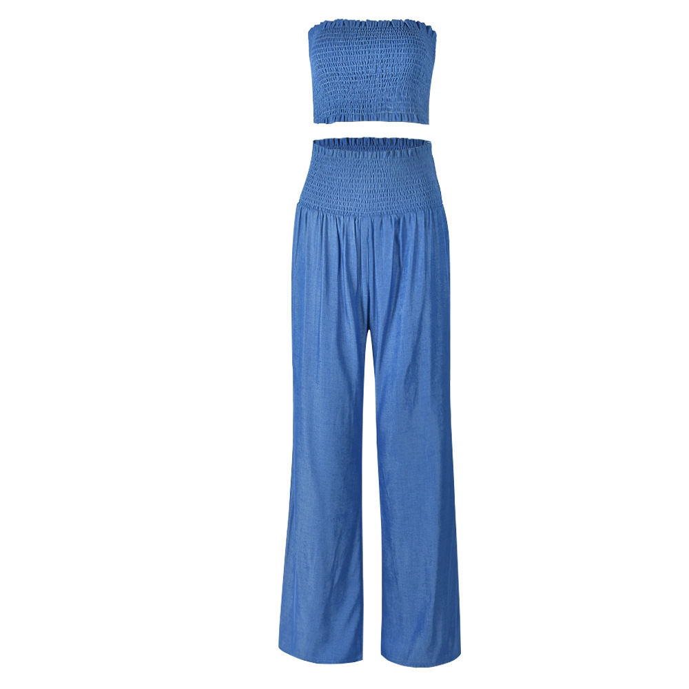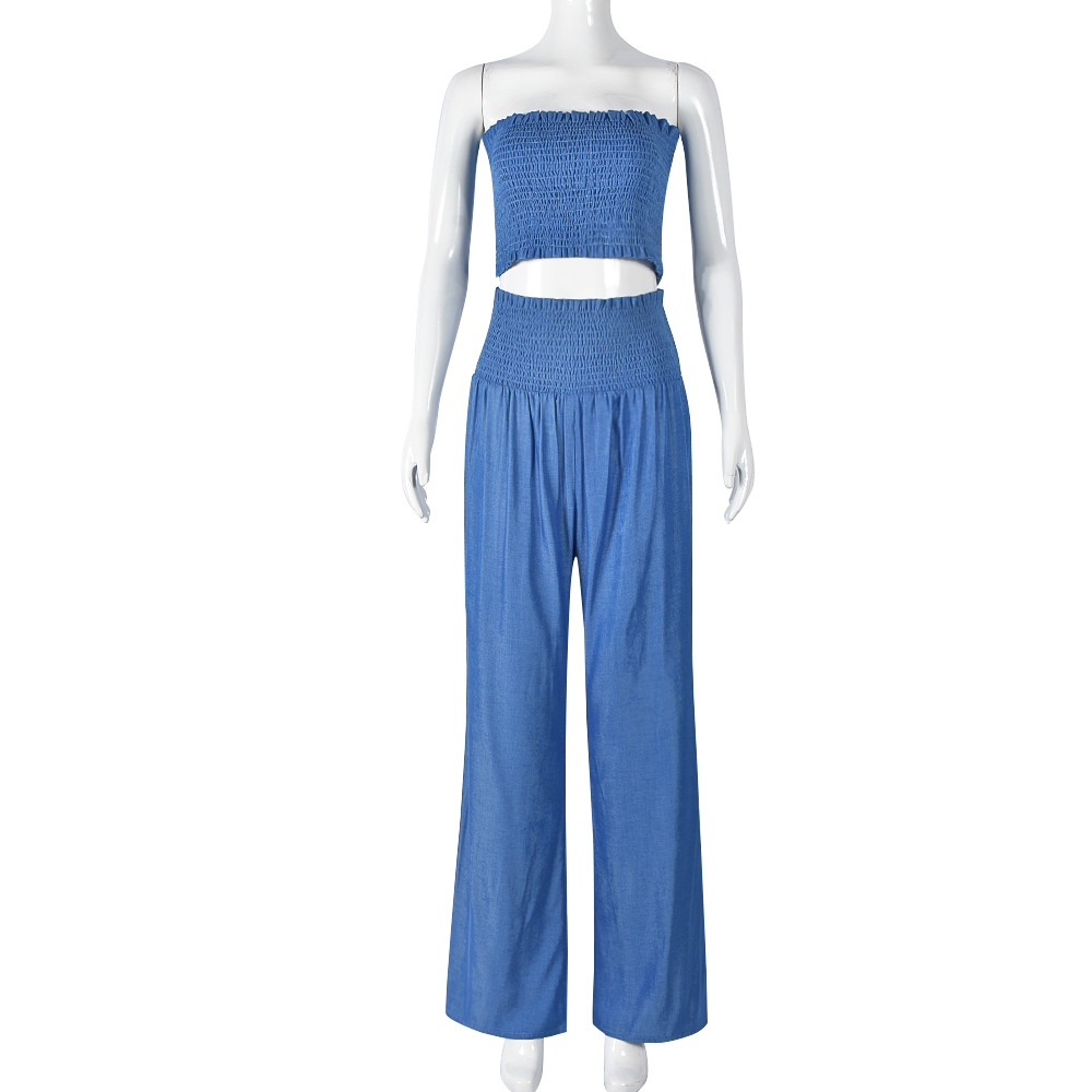 This regular-fit summer set, crafted from solid polyester, features a strapless crop top with ruffle and smocked details, paired with full-length pants for a chic and breezy look.