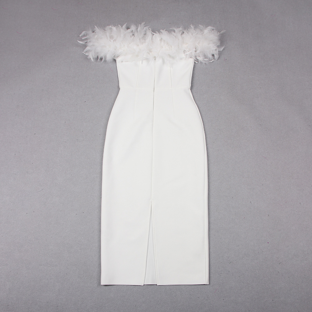 Fit: Slim Fabric: Polyester Pattern: Solid Element: Rhinestone, Feather, Lace/Tulle/Fishnet, Split, Zipper Neckline: Off Shoulder Sleeve Length: Sleeveless Dress/Skirt Length: Midi
